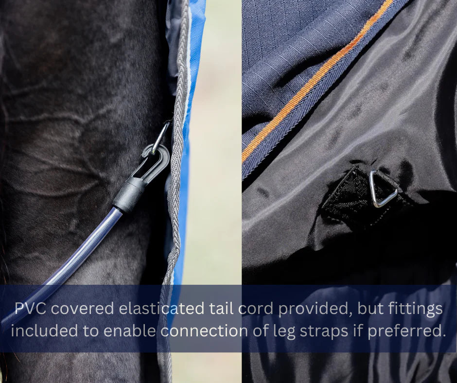 The non-static chest clip and ring allows freedom of movement and helps to distribute pressure while the shaping of the rug ensures maximum comfort and fit. These rugs come standard with a PVC covered tail cord, however connections are available to utilise leg straps if desired.