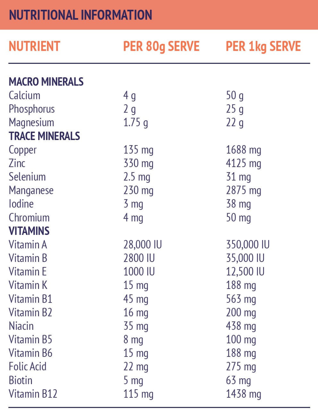 Lucerne Leaf Meal, Dicalcium Phosphate, Magnesium Oxide, Marine Sourced Calcium, Yeast Derived Prebiotic, Threonine, Lysine, Glutamine, Vitamin and Mineral Premix with Natural Vitamin E and Organic Minerals.